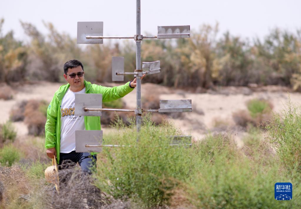 在中科院新疆生態(tài)與地理研究所策勒沙漠研究站天然試驗區,買(mǎi)爾當查看集沙儀工作狀況(6月12日攝)。新華社記者 王菲 攝