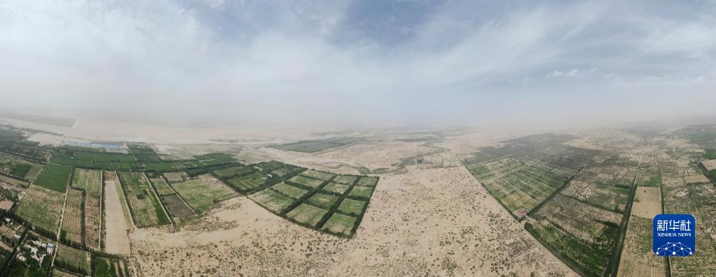 6月12日拍攝的中科院新疆生態(tài)與地理研究所策勒沙漠研究站天然試驗區(無(wú)人機全景照片)。新華社記者 郝昭 攝