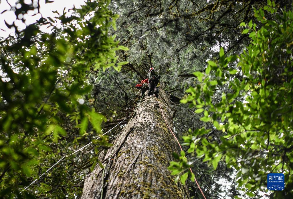 6月15日,國家重要野生植物種質(zhì)資源庫辰山中心負責人鐘鑫(下)和助手在攀爬亞洲第一高樹(shù)附近的高樹(shù),采集數據。新華社記者 晉美多吉 攝