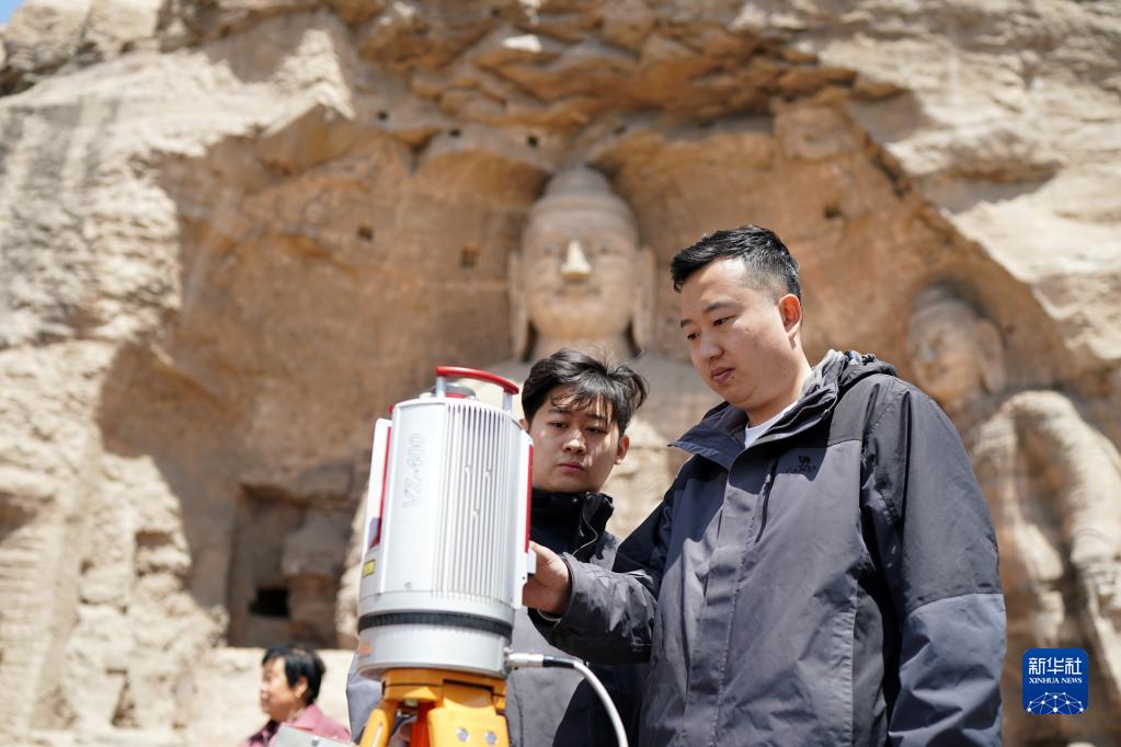 在山西大同云岡石窟,工作人員在進(jìn)行數據采集(2021年5月8日攝)。