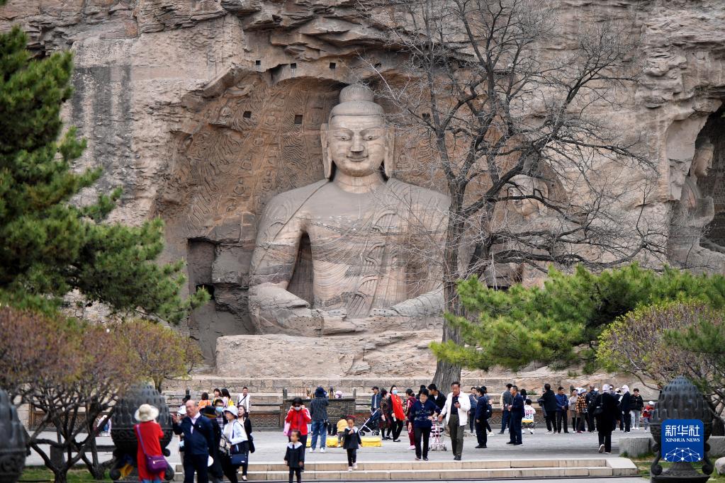 游客在山西大同云岡石窟游覽(2021年5月9日攝)。