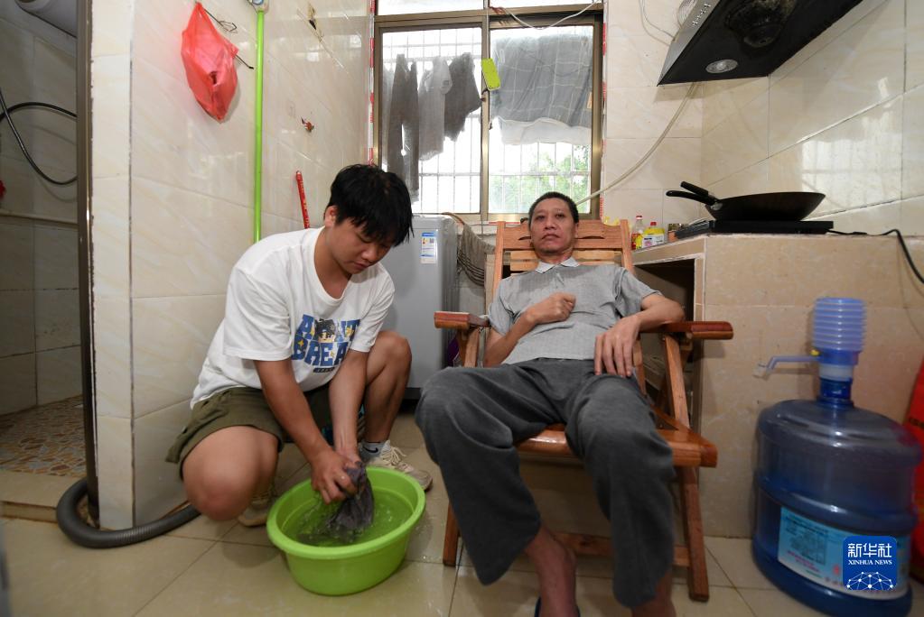 6月17日,在廣西南寧,袁東旺在學(xué)校附近的出租房里洗毛巾,準備幫父親洗臉。