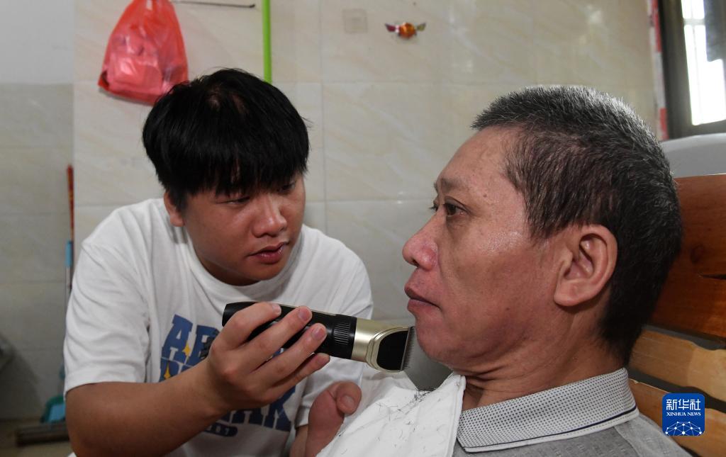 6月17日,在廣西南寧,袁東旺在學(xué)校附近的出租房里給父親剃胡子。