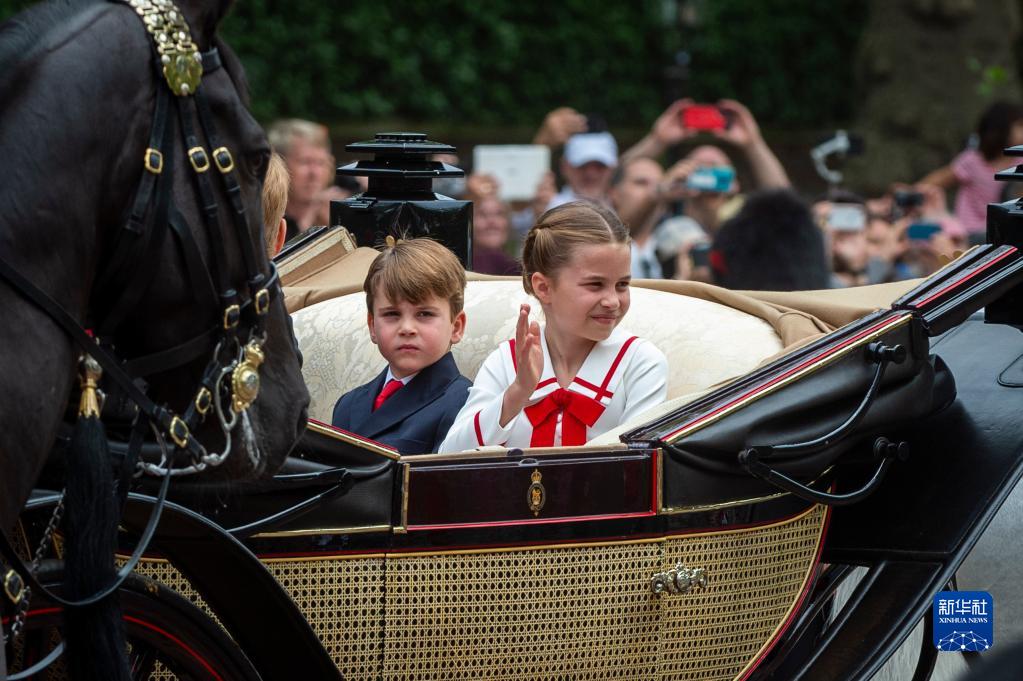 6月17日,在英國倫敦,夏洛特公主(右)與路易王子乘坐馬車(chē)參加閱兵式。