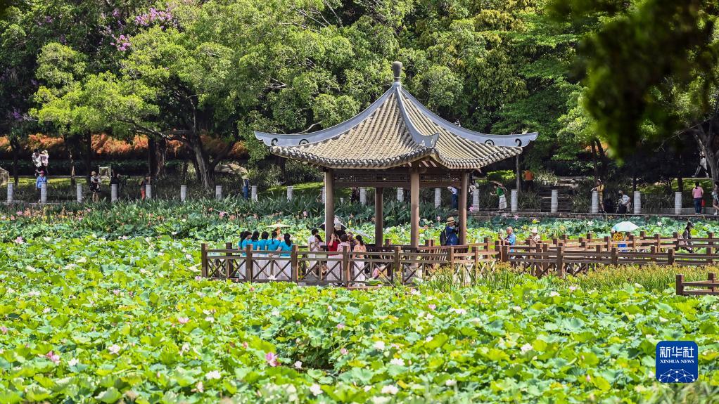 6月18日,人們在南寧市南湖公園荷花亭觀(guān)賞荷花。