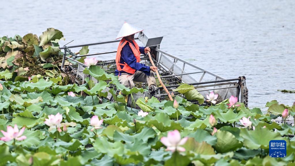 6月18日,工作人員在南寧市南湖公園護理荷花池。