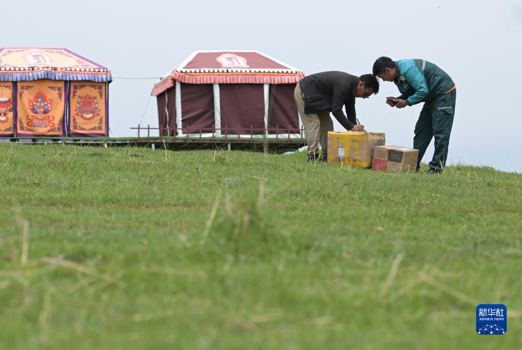 哈弄奪機(右)在若爾蓋大草原上為牧場(chǎng)經(jīng)營(yíng)者羅旦投送快遞(6月15日攝)。