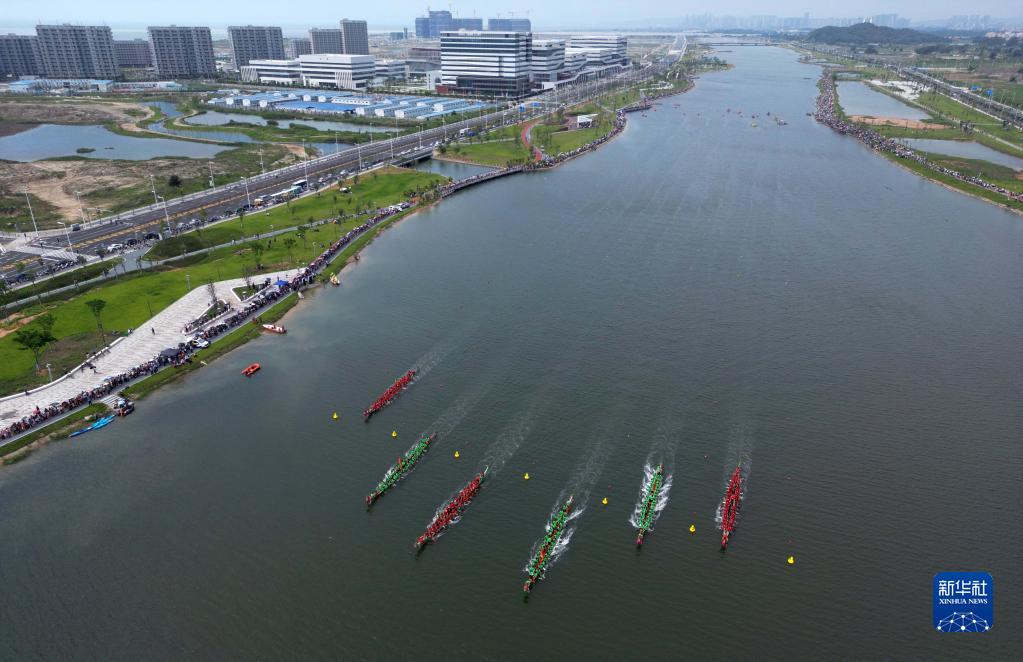 6月18日,龍舟隊在廣東汕頭澄海區海明公園參加賽龍舟活動(dòng)(無(wú)人機照片)。