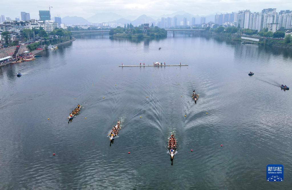 6月18日,龍舟隊在安徽省黃山市屯溪區新安江水域上展開(kāi)角逐(無(wú)人機照片)。