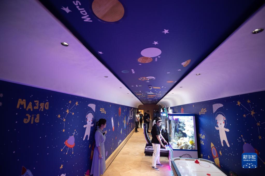 6月18日,在“林都號”旅游列車(chē)兒童游樂(lè )室內,乘客體驗游戲設備。