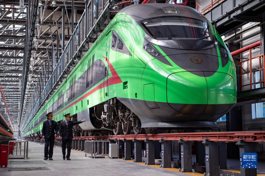 在拉薩機輛整備中心,“復興號”動(dòng)車(chē)組在檢修庫進(jìn)行整備作業(yè)(1月11日攝)。