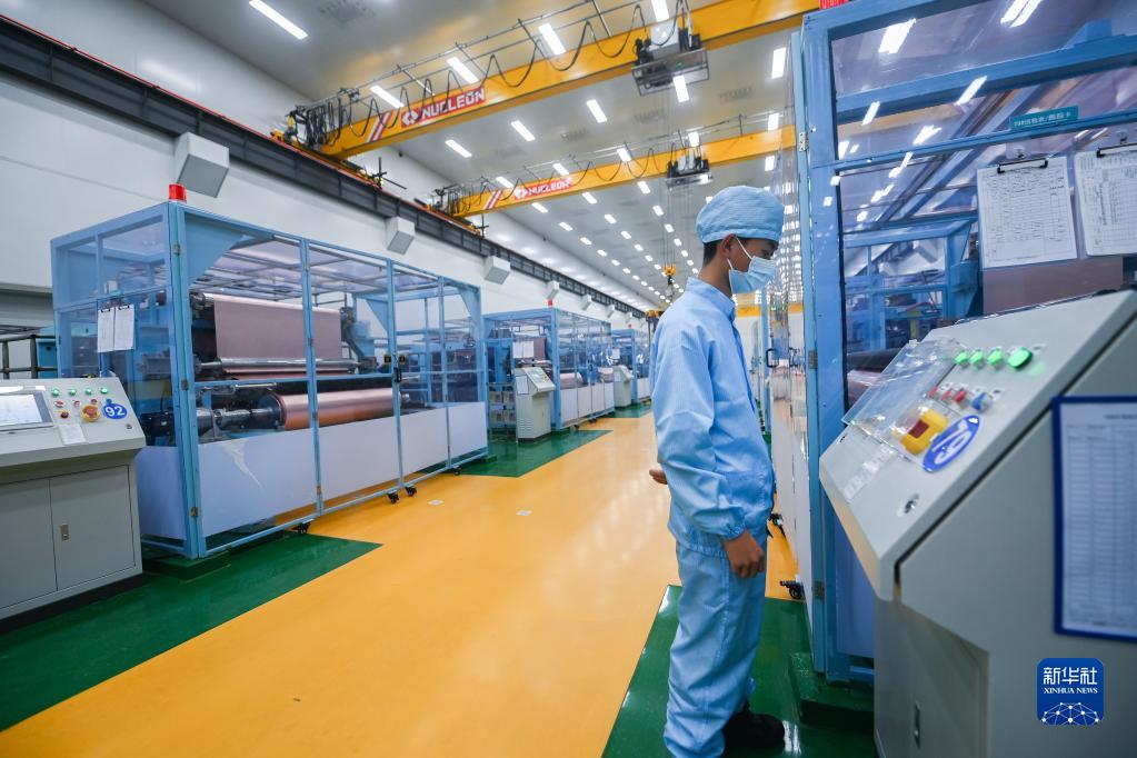6月19日,在位于東陽(yáng)市南馬鎮花園村的浙江花園新能源股份有限公司生產(chǎn)車(chē)間,工人在生產(chǎn)高性能銅箔產(chǎn)品。