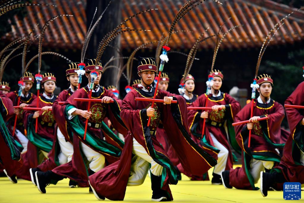 在曲阜孔廟,工作人員在辛丑年祭孔大典上起舞樂(lè )奏《萬(wàn)世師表》,以紀念孔子誕辰2572年(2021年9月28日攝)。