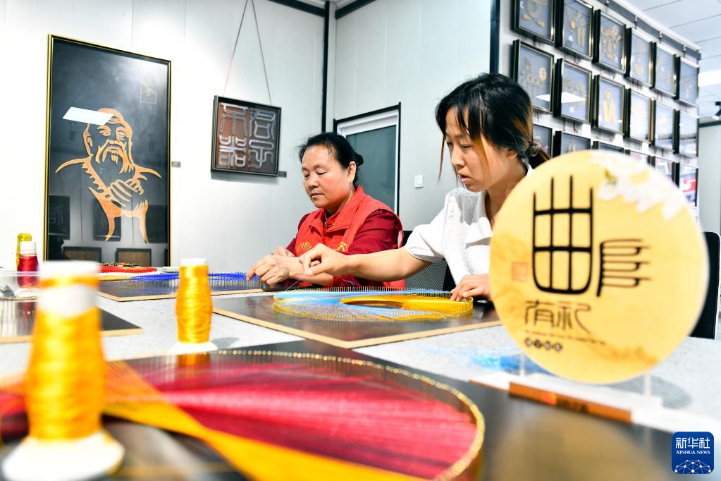 在曲阜市尼山腳下的魯源新村文化街區,工作人員在制作弦絲畫(huà)(2023年6月8日攝)。