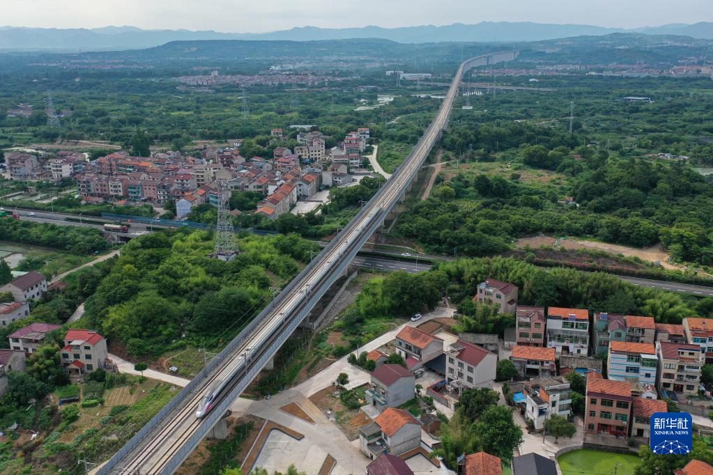 列車(chē)在杭臺高鐵位于浙江嵊州境內的路段行駛(6月19日攝,無(wú)人機照片)。