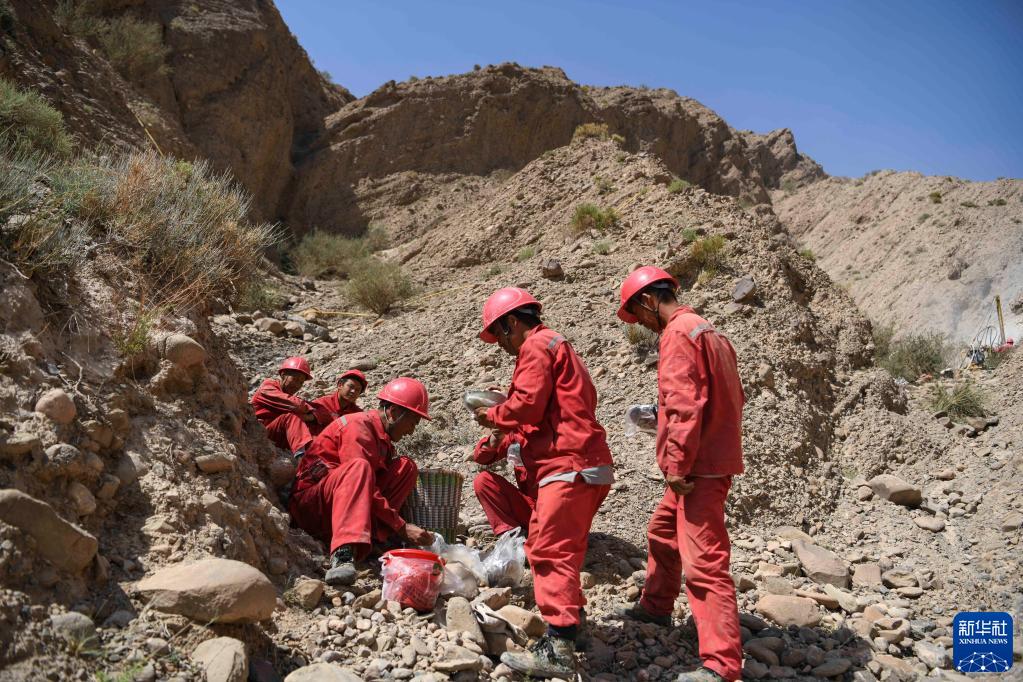 東方物探公司塔里木物探處2170隊的鉆工在山間工地上吃午飯(6月18日攝)。新華社記者 胡虎虎 攝