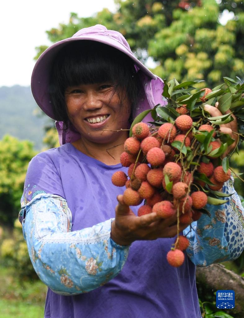 6月20日,在廣州增城區的正旭農業(yè)科技有限公司果園,果農展示剛采摘的荔枝。