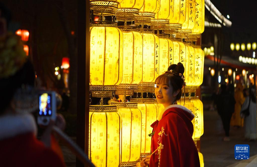 游客在洛陽(yáng)市洛邑古城內游玩拍照(2023年2月28日攝)。