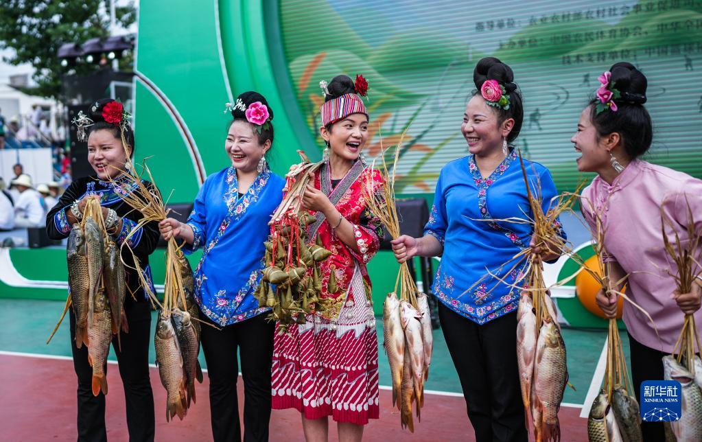 6月20日,少數民族同胞在展示投籃比賽獎品。