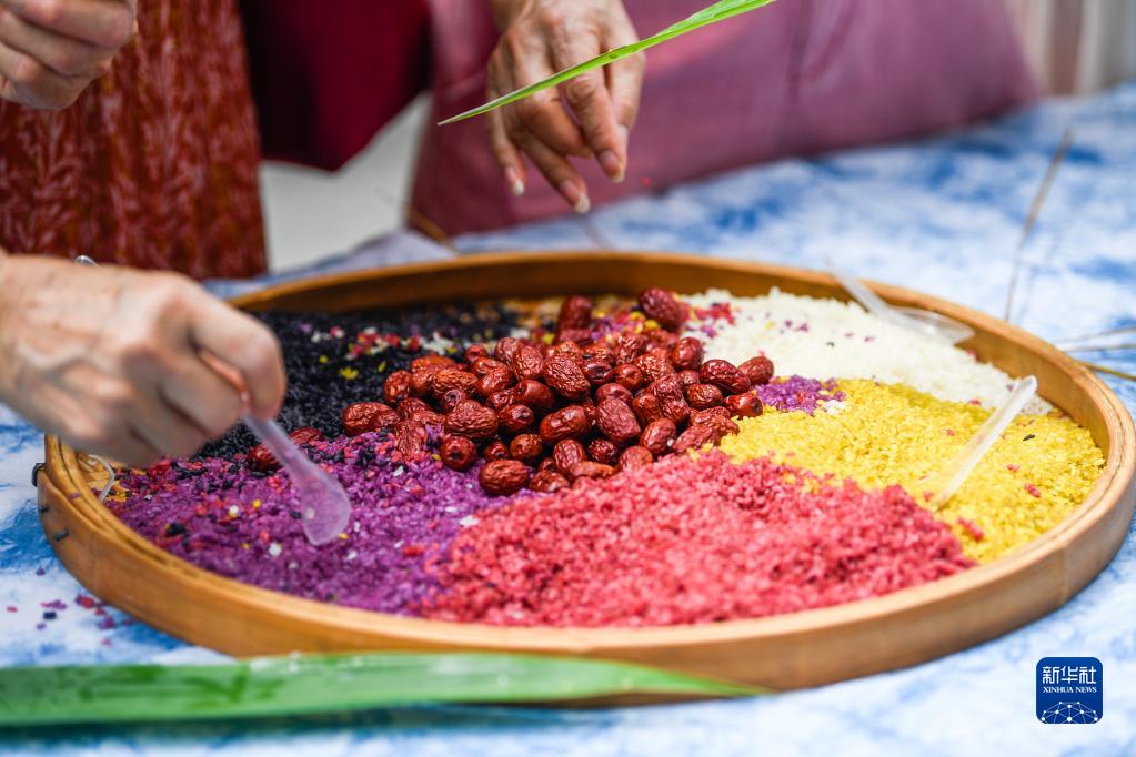 6月17日,在貴州省黔西南布依族苗族自治州冊亨縣舉行的“盛夏賦雅趣,錦繡滿(mǎn)粽香”端午節活動(dòng)中,居民在包粽子。