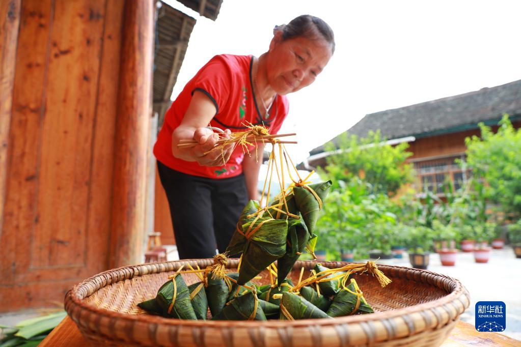 6月16日,在貴州省黔東南苗族侗族自治州劍河縣柳川鎮加禾村,村民擺放剛煮熟的粽子。