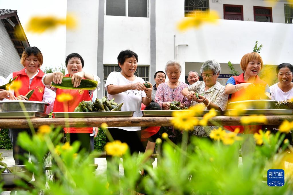 6月20日,四川省廣安市前鋒區志愿者在觀(guān)閣鎮敬老院與老人們一起包粽子迎端午。
