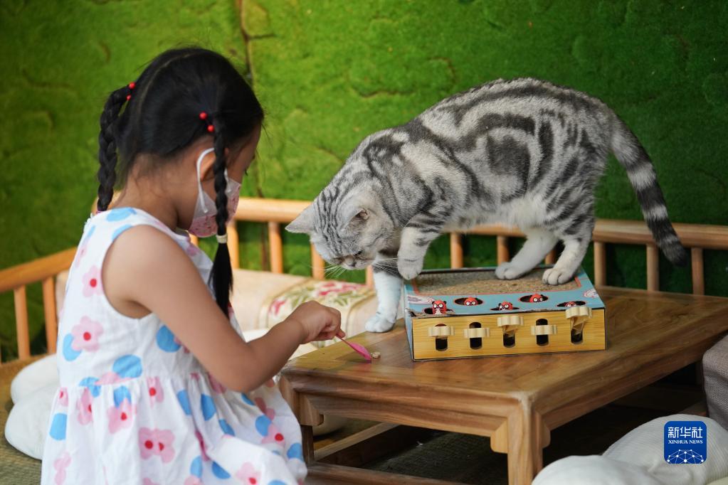 女孩與貓咪“尾牙”互動(dòng)(6月10日攝)。