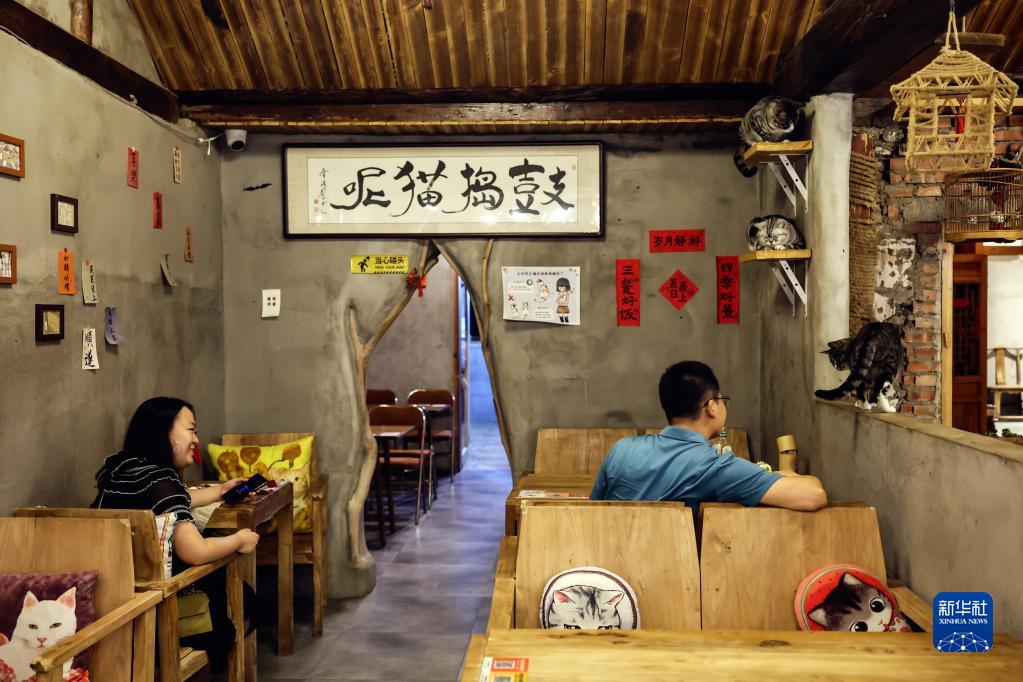 顧客與貓咪互動(dòng)(6月19日攝)。