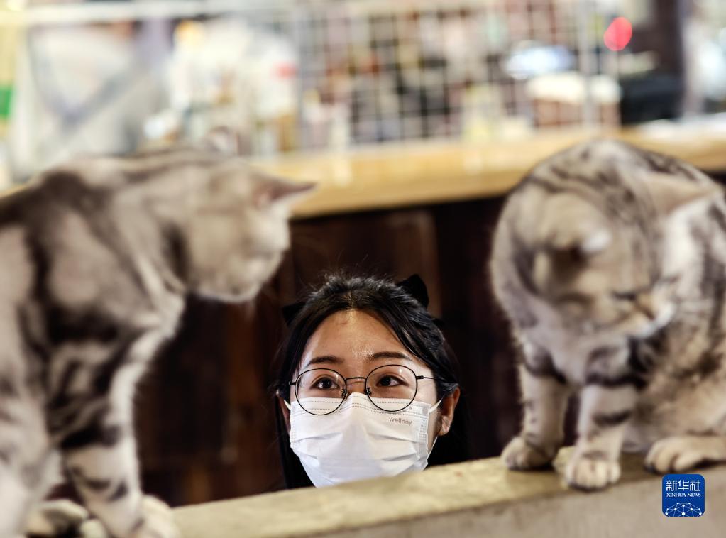顧客與貓咪互動(dòng)(6月10日攝)。