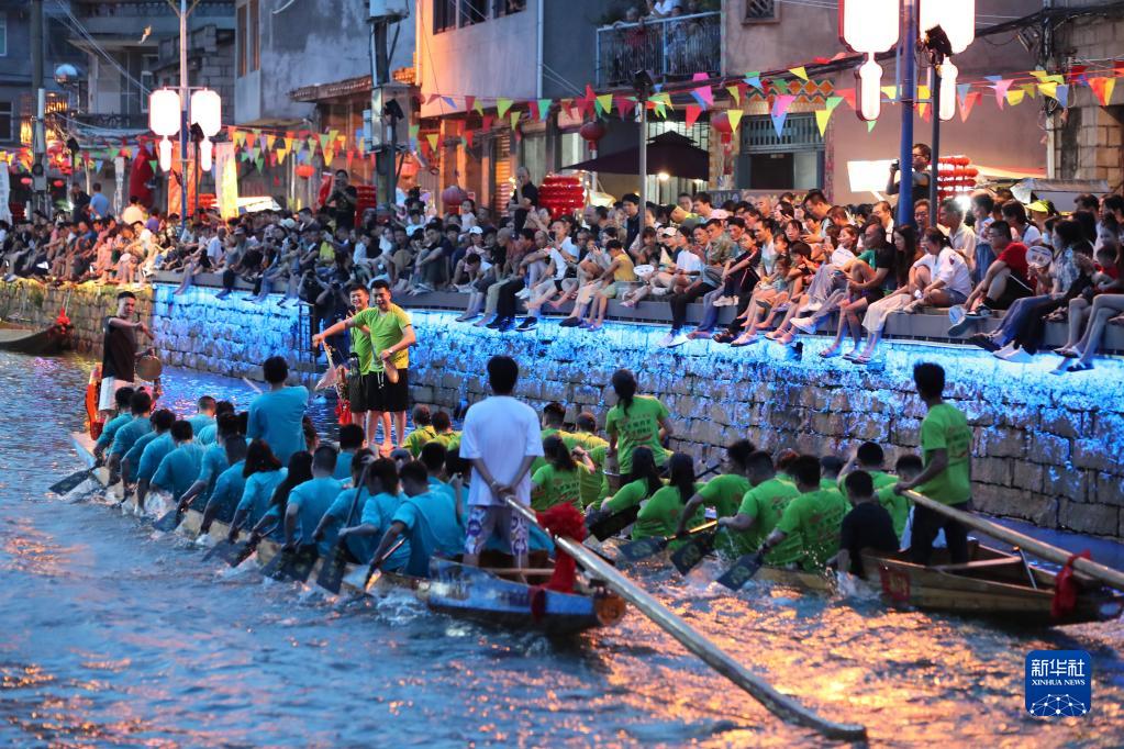 端午來(lái)臨,福建省福州市長(cháng)樂(lè )區三溪村獨有的龍舟夜渡迎端午活動(dòng)如約而至。夜幕降臨,華燈初上,隨著(zhù)鼓聲響起,數十條龍舟陸續出現在古村的小溪中,清澈的水面上船槳翻飛、龍舟飛馳,夾岸觀(guān)眾人頭攢動(dòng),加油吶喊不絕于耳,一派熱鬧景象。夜賽龍舟習俗在三溪村已經(jīng)沿襲600多年,每年端午節前后,村里的男女老少都會(huì )相聚一起夜競龍舟,借此祈盼風(fēng)調雨順、平安健康。