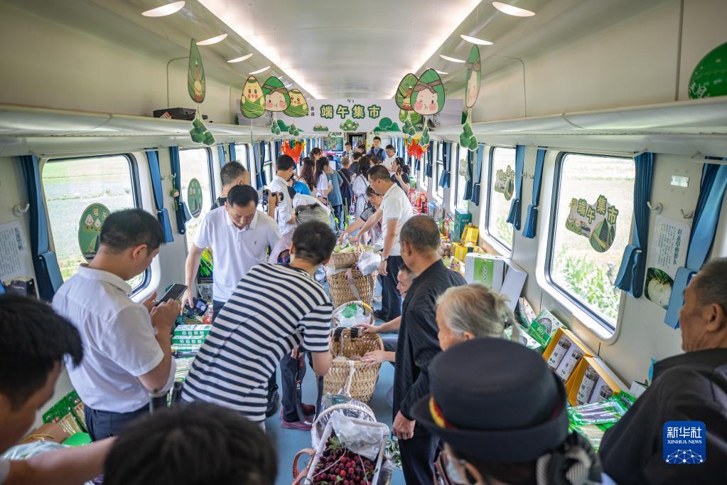 在“集市車(chē)廂”里,沿線(xiàn)村民將自家種的粽葉、艾草、菖蒲、糯米、蔬菜等農產(chǎn)品整齊擺放,供乘車(chē)旅客選擇購買(mǎi)。逛完“集市”,在“民俗體驗”車(chē)廂,旅客還可欣賞民族特色舞蹈、古箏彈奏、吉他彈唱等節目,親手制作粽子及艾草香包,體驗傳統文化民俗。