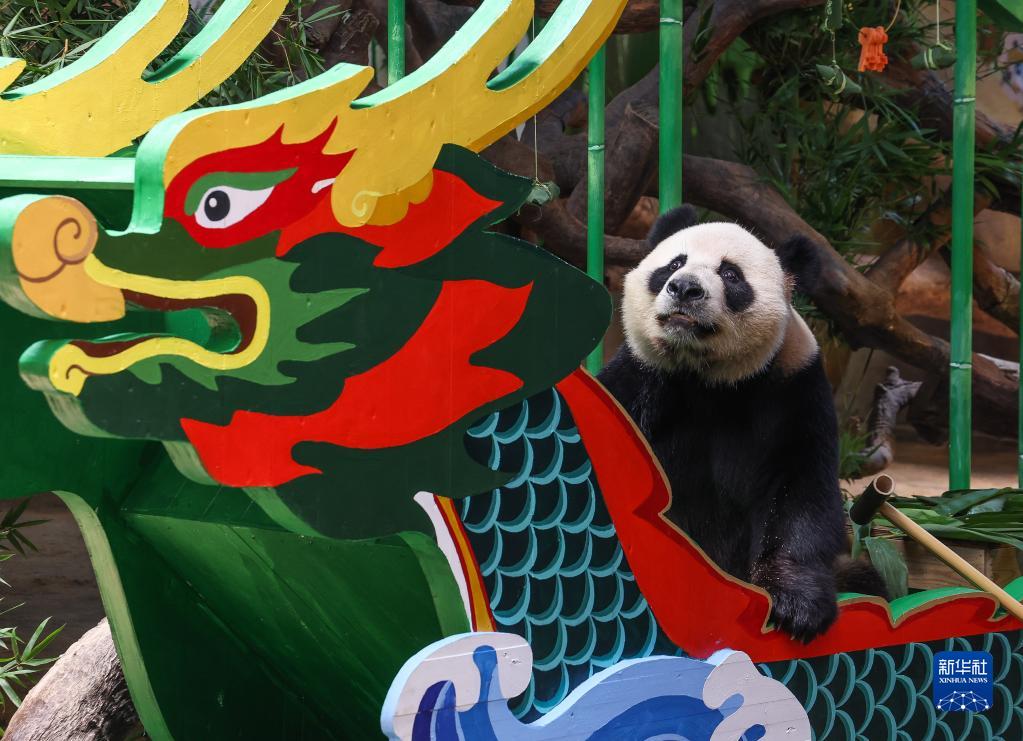 當日,廣州長(cháng)隆野生動(dòng)物世界熊貓館的10余只大熊貓迎來(lái)一個(gè)特別的端午節,它們與游客一起渡龍船、吃粽子,“體驗”一把端午文化的氛圍。