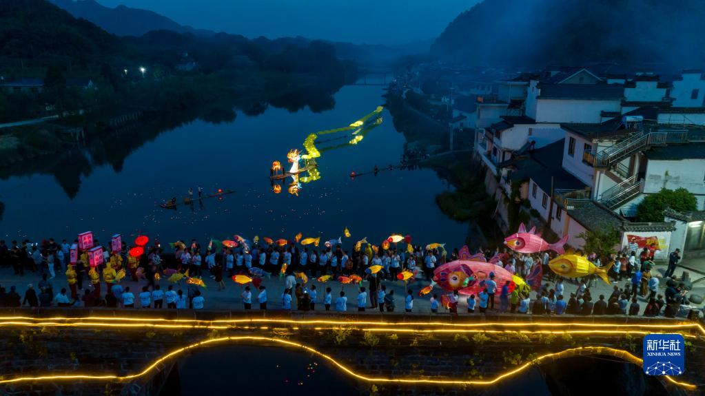 6月16日,在安徽省寧國市胡樂(lè )鎮,“魚(yú)燈”“河燈”和“龍燈”相互輝映(無(wú)人機照片)。
