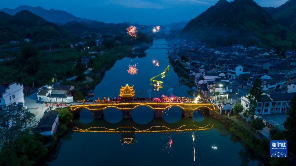 6月16日,在安徽省寧國市胡樂(lè )鎮,“魚(yú)燈”“河燈”和“龍燈”相互輝映(無(wú)人機照片)。