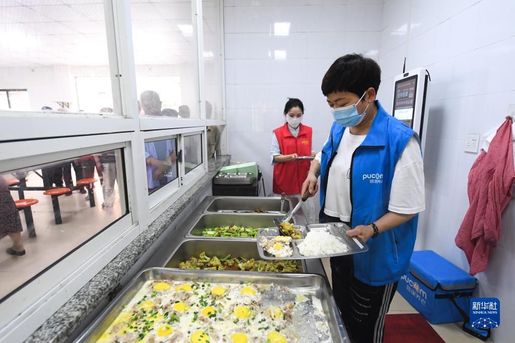 在埭溪鎮中央食堂,工作人員為就餐的老年人打飯(2023年5月30日攝)。