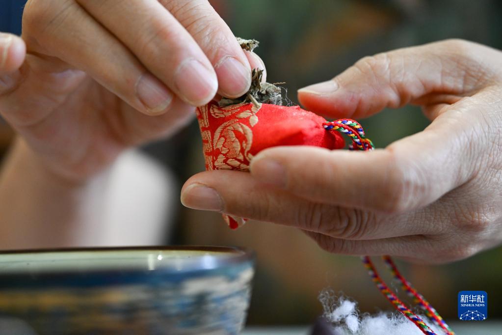 陳玉秋將艾草放入香囊中(6月20日攝)。