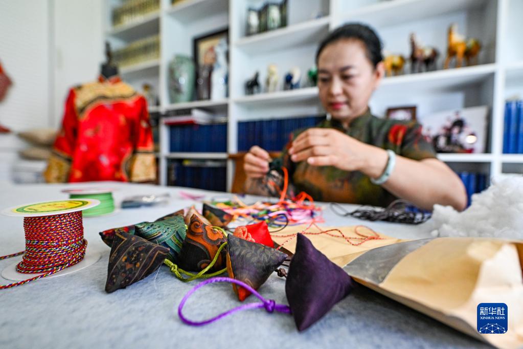 55歲的陳玉秋是國家級非物質(zhì)文化遺產(chǎn)滿(mǎn)族旗袍制作技藝代表性傳承人。端午節前,為了讓更多人了解端午節傳統習俗和滿(mǎn)族旗袍技藝,陳玉秋來(lái)到吉林省吉林市博物館,教人們縫制香囊,并將手工制作的香囊贈送給市民。