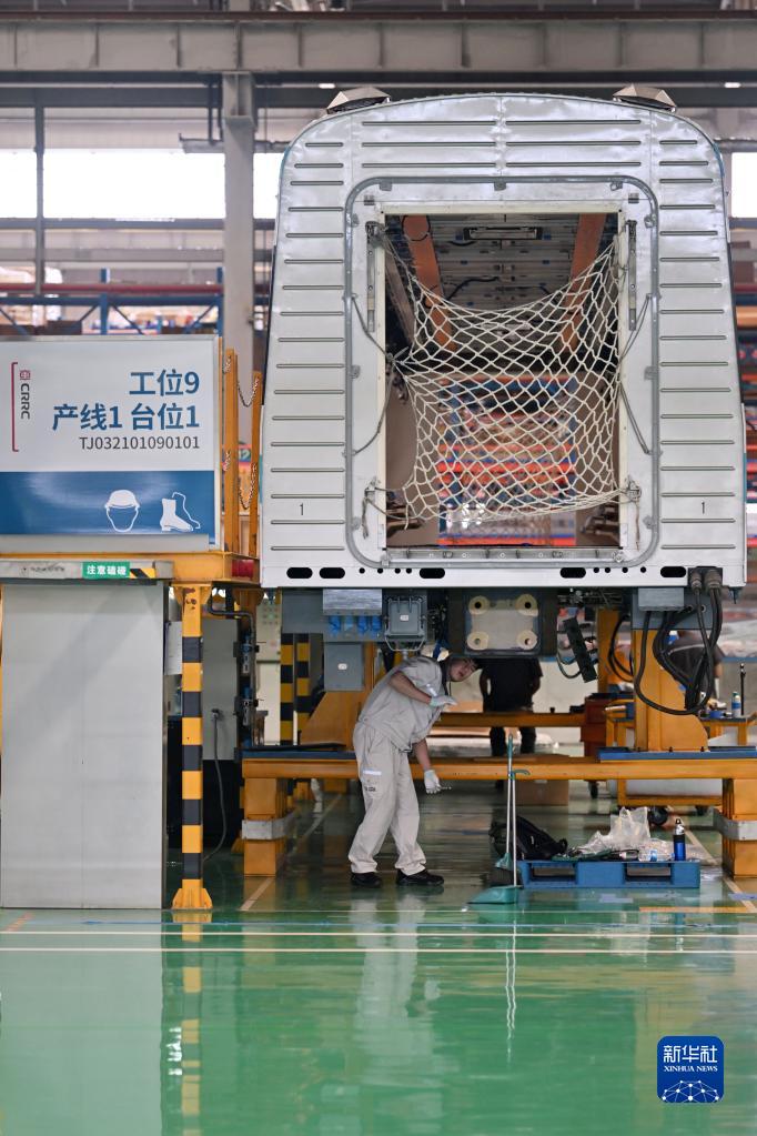 工作人員在天津中車(chē)唐車(chē)軌道車(chē)輛有限公司的組裝車(chē)間內檢查車(chē)底(6月20日攝)。