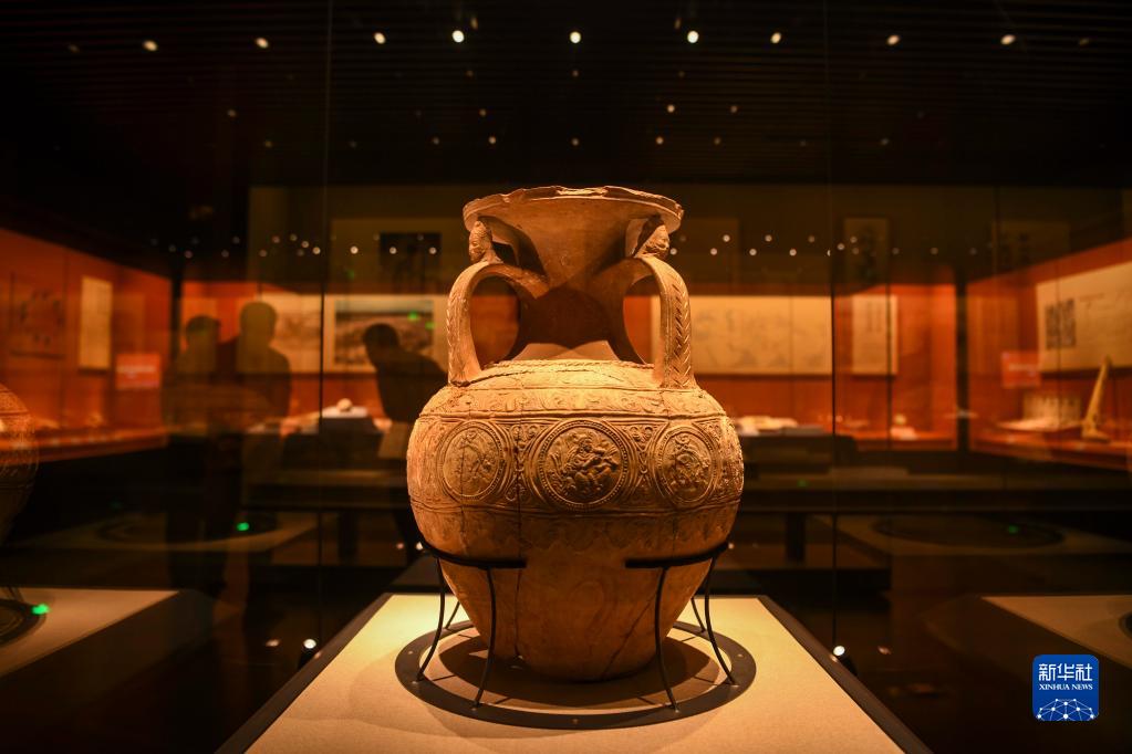 這是在新疆喀什地區博物館拍攝的國家一級文物“三耳壓花陶罐”(6月12日攝)。新華社記者 胡虎虎 攝