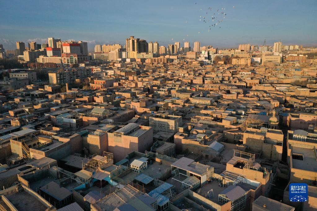 鴿群飛過(guò)喀什古城(3月10日攝,無(wú)人機照片)。新華社記者 李響 攝