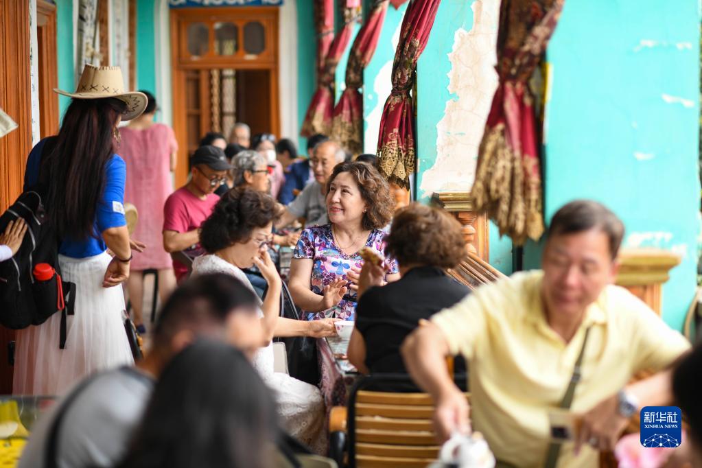 人們在新疆喀什古城景區“百年老茶館”的二樓陽(yáng)臺上喝茶聊天(6月13日攝)。新華社記者 胡虎虎 攝