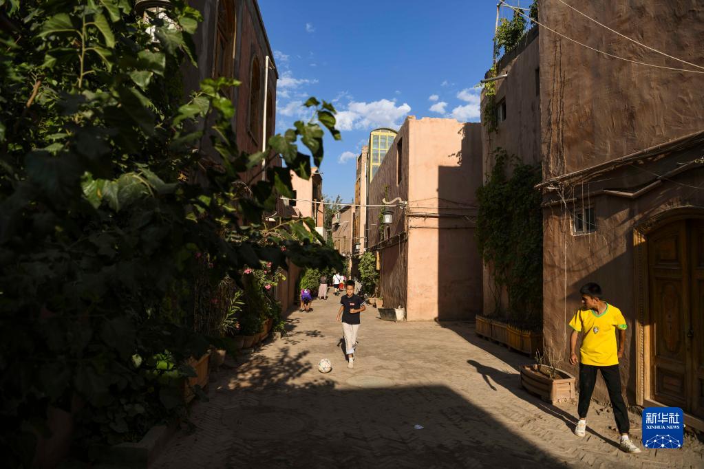 小朋友在新疆喀什古城景區的小巷內踢球(6月15日攝)。新華社記者 胡虎虎 攝
