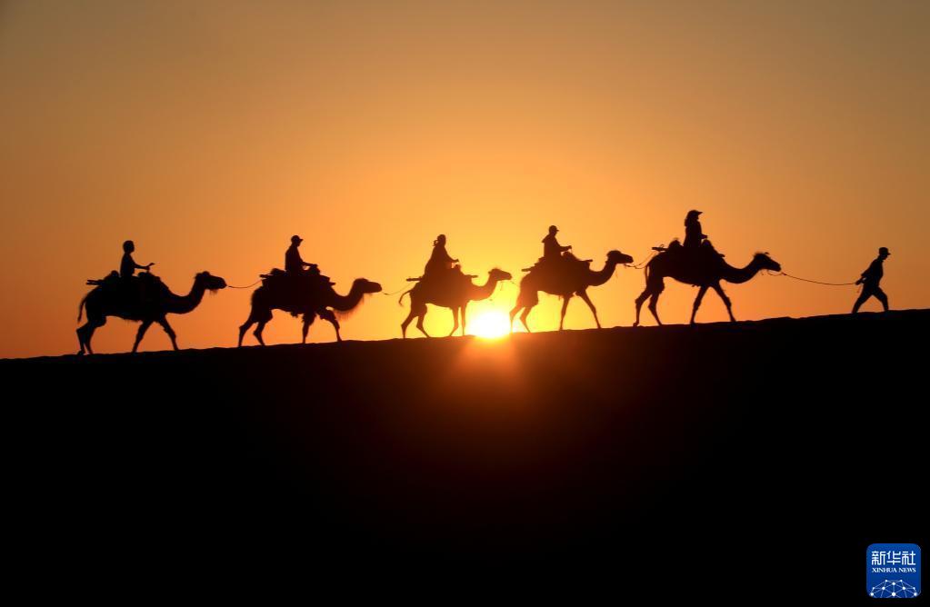 游客騎著(zhù)駱駝在敦煌鳴沙山月牙泉景區游覽(6月7日攝)。