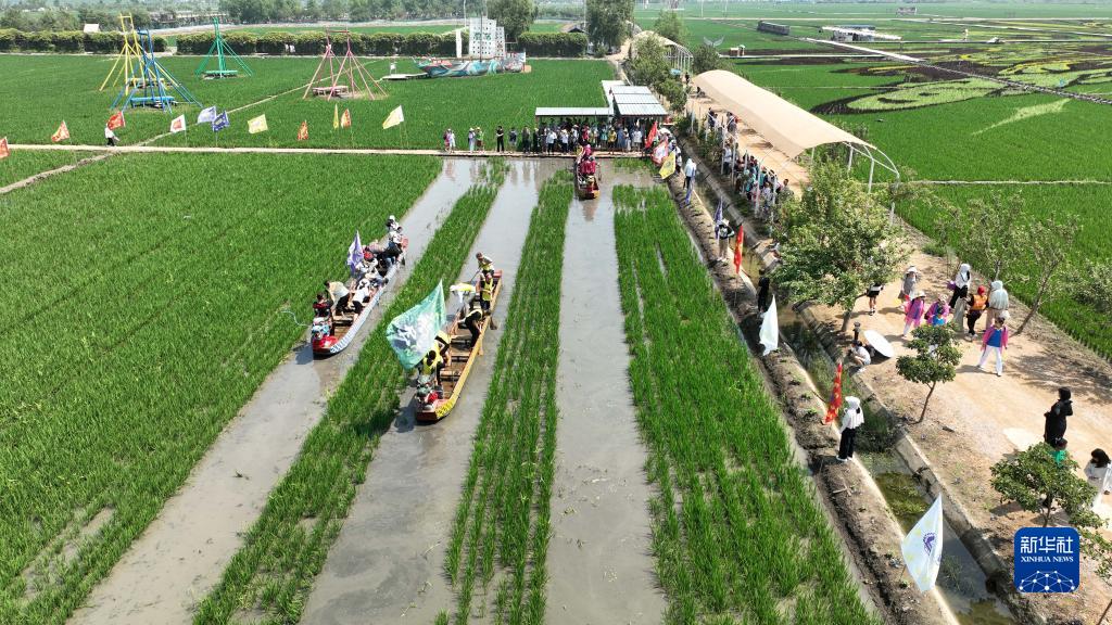 6月22日,參賽者在沈陽(yáng)市沈北新區興隆臺錫伯族鎮稻田的泥地中劃龍舟 (無(wú)人機照片) 。