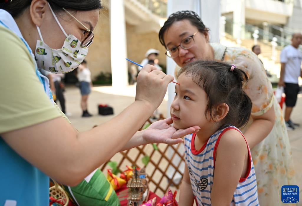 6月22日,海南省博物館的工作人員給孩子“點(diǎn)雄黃”。