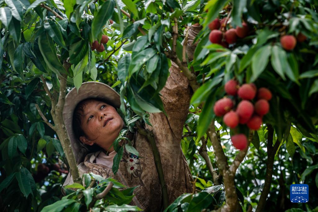 果農在云南省屏邊縣灣塘鄉米坡荔枝基地采摘荔枝(6月21日攝)。