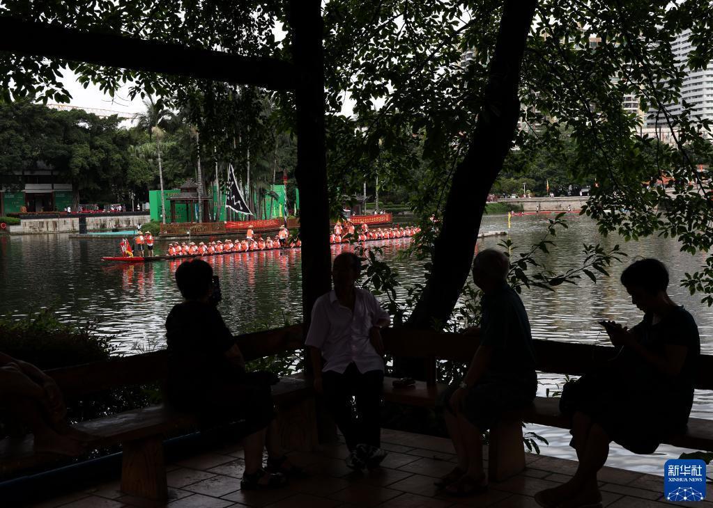 6月22日,在廣州荔枝灣,市民觀(guān)看泮塘龍船在為鹽步老龍前來(lái)“探親”做準備。