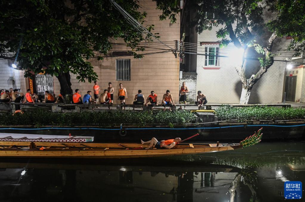 深夜,經(jīng)過(guò)一晚高強度訓練之后,佛山疊滘東勝村的“扒仔”(槳手)躺在龍船上休息(6月16日攝)。