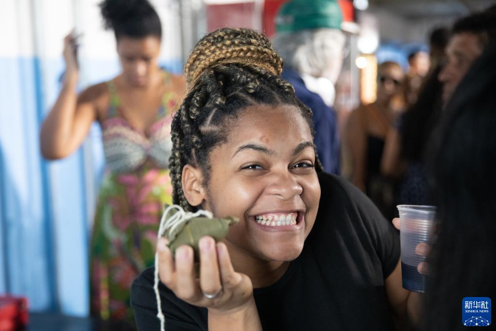 6月18日,在巴西里約熱內盧圣瑪爾塔社區,一名居民展示領(lǐng)到的粽子。端午節前,巴西中國浙江商會(huì )為圣瑪爾塔社區居民帶來(lái)200多份基礎食物籃和200多個(gè)粽子,共同感受中國傳統佳節的氣氛。