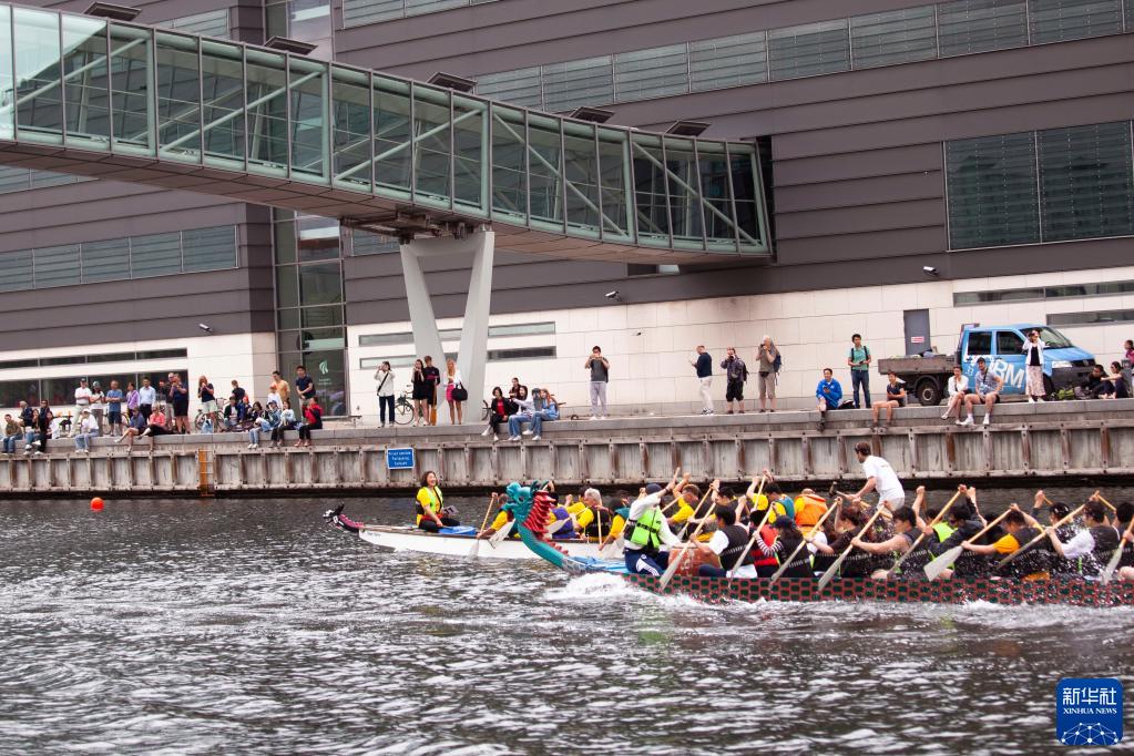 6月18日,在丹麥哥本哈根南港碼頭舉行的第六屆哥本哈根龍舟文化節上,人們比賽劃龍舟。